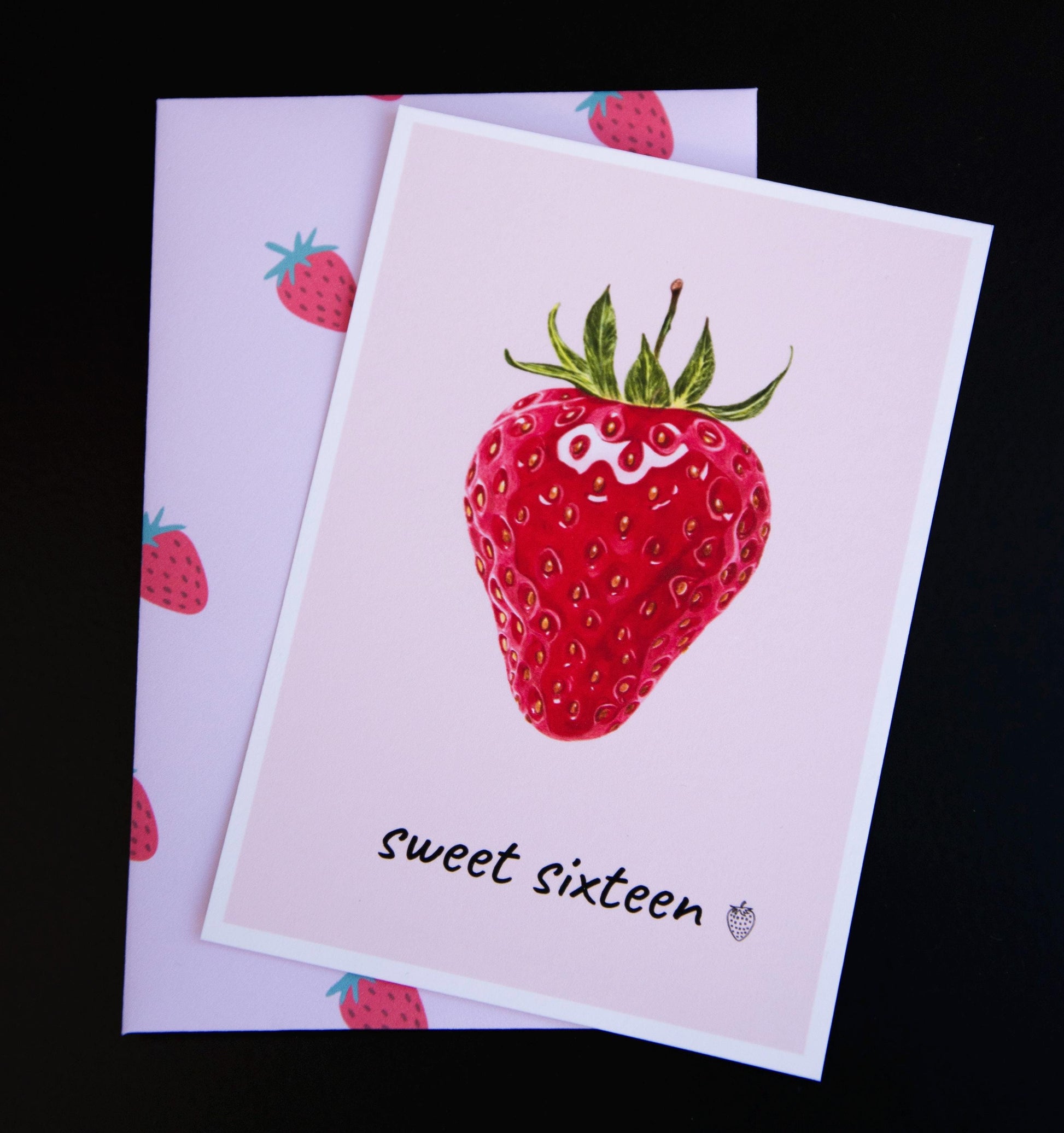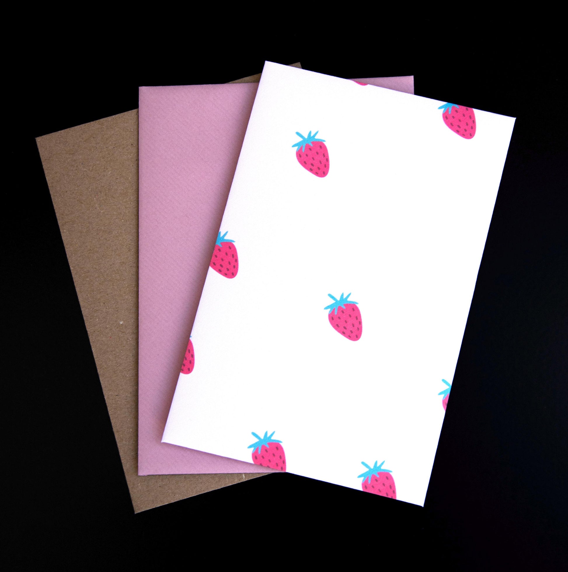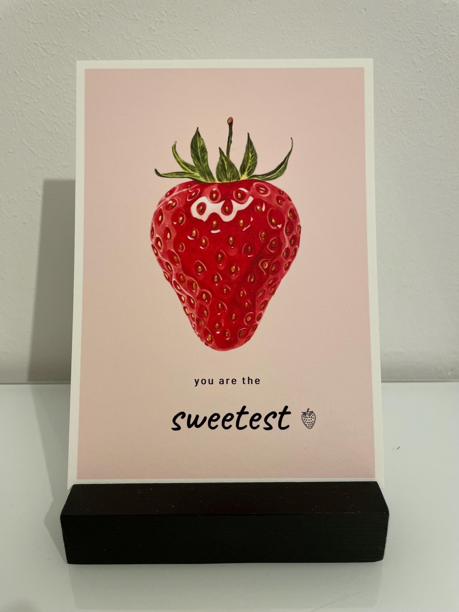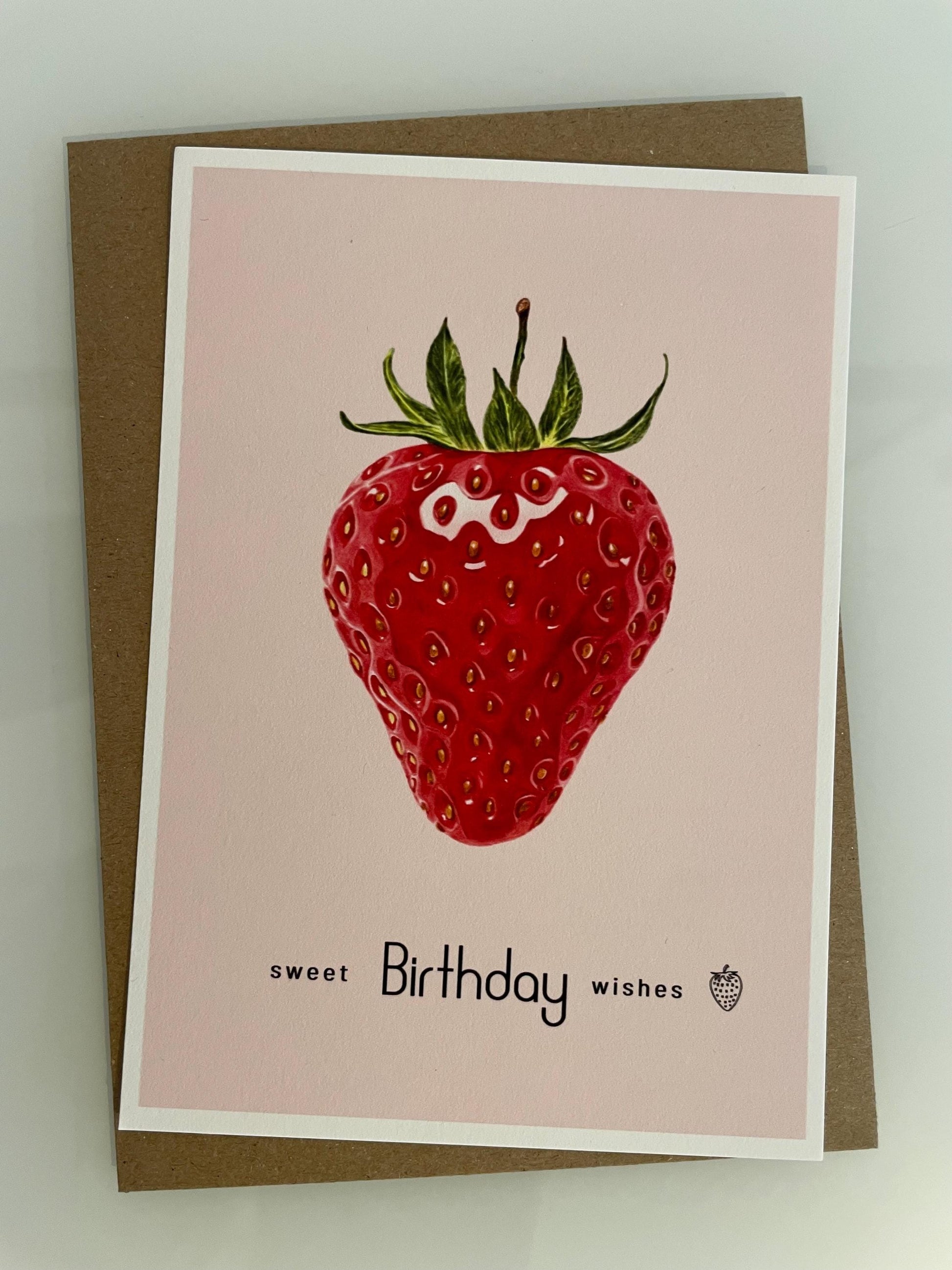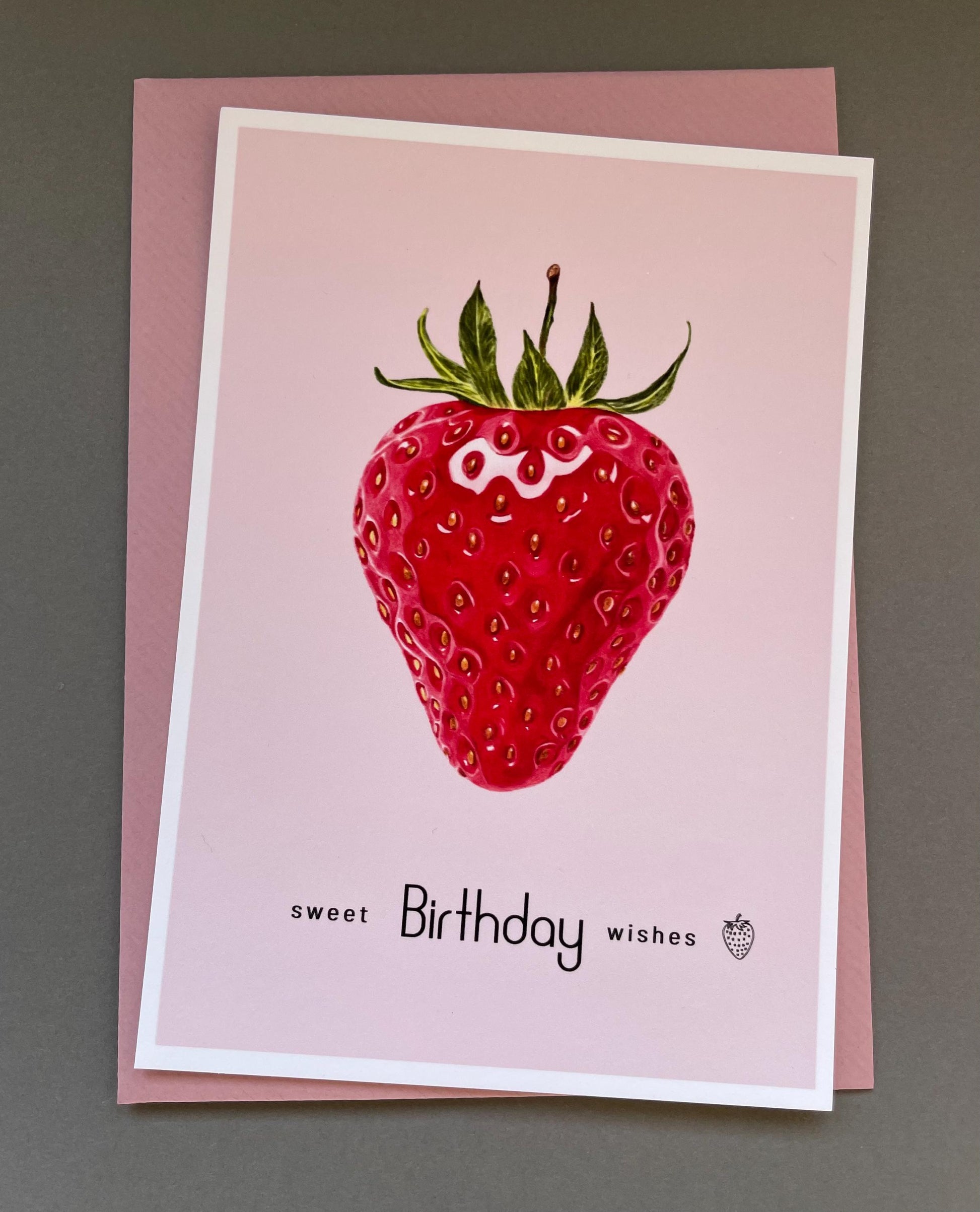 Diese liebevoll mit Polychromos Künstlerfarbstiften gemalte Geburtstagskarte zeigt ein süßes Erdbeermotiv im A6-Format. Gestalte sie ganz individuell mit deinem eigenen Wunschtext. Wähle aus drei Umschlagvarianten: natur, rosé oder mein eigener Erdbeer-Print – perfekt, um deinem Geburtstagsgruß eine fruchtig-fröhliche Note zu verleihen!