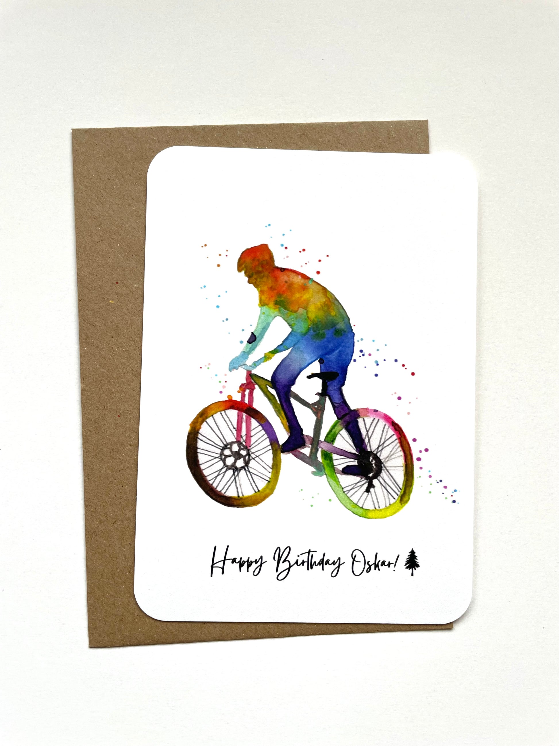 Diese farbenfrohe Aquarellkarte mit Mountainbiker-Motiv ist der perfekte Geburtstagsgruß für aktive Menschen. Der individuell anpassbare Grußtext macht die Karte noch persönlicher. Verschenke Motivation für die nächste Tour – „Have a good ride“.