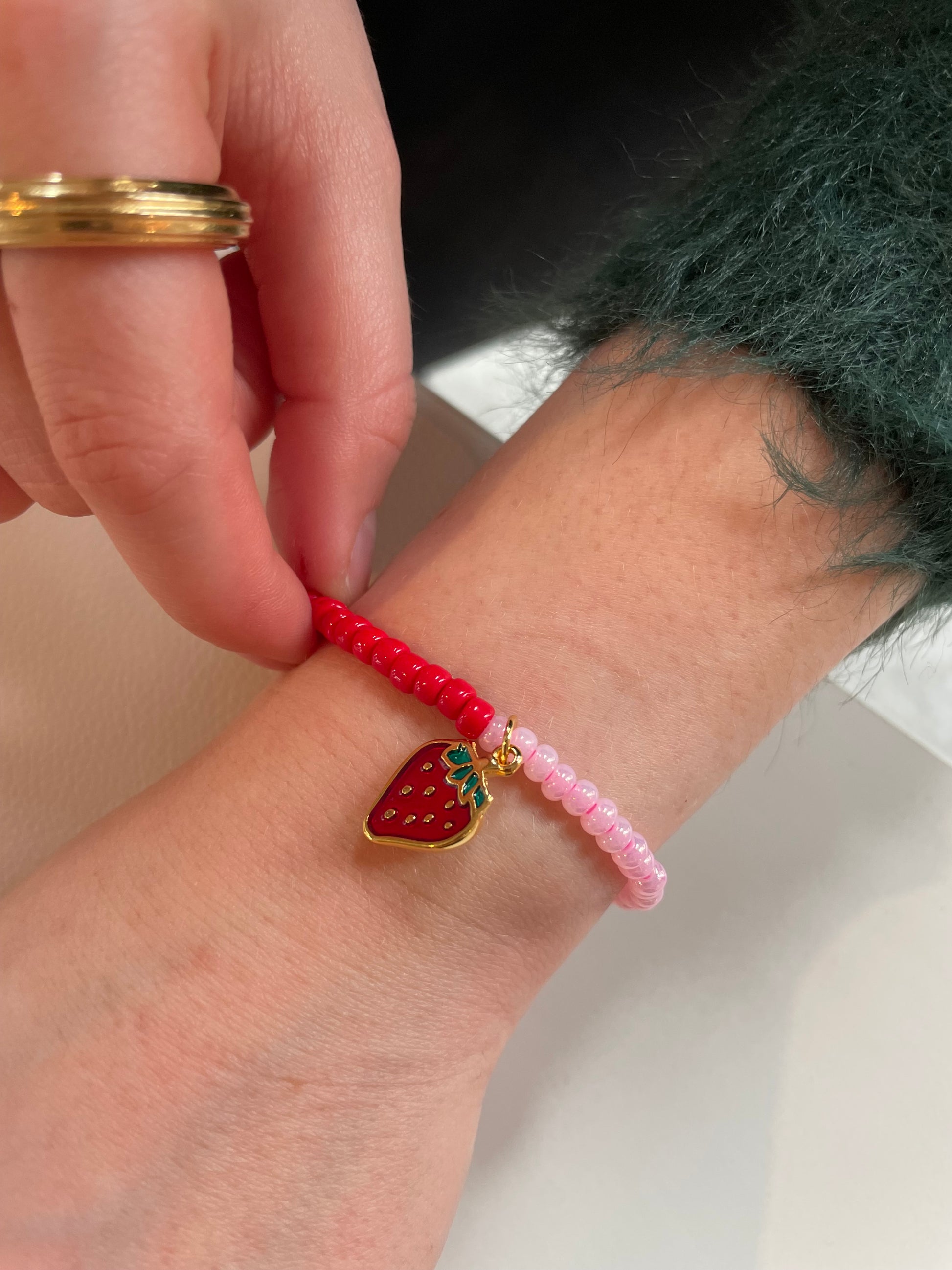 Das Armband ist mit einem vergoldeten Erdbeer-Anhänger gearbeitet. Hochwertige japanischen Miyuki-Glasperlen in rosé und rot mit einer vergoldeten Perle zum Abschluß. Dank des elastischen Bandes passt es sich perfekt an Handgelenke von ca. 14–16 cm an. Für noch besseren Sitz gib mir gerne den Umfang des Handgelenks bekannt.