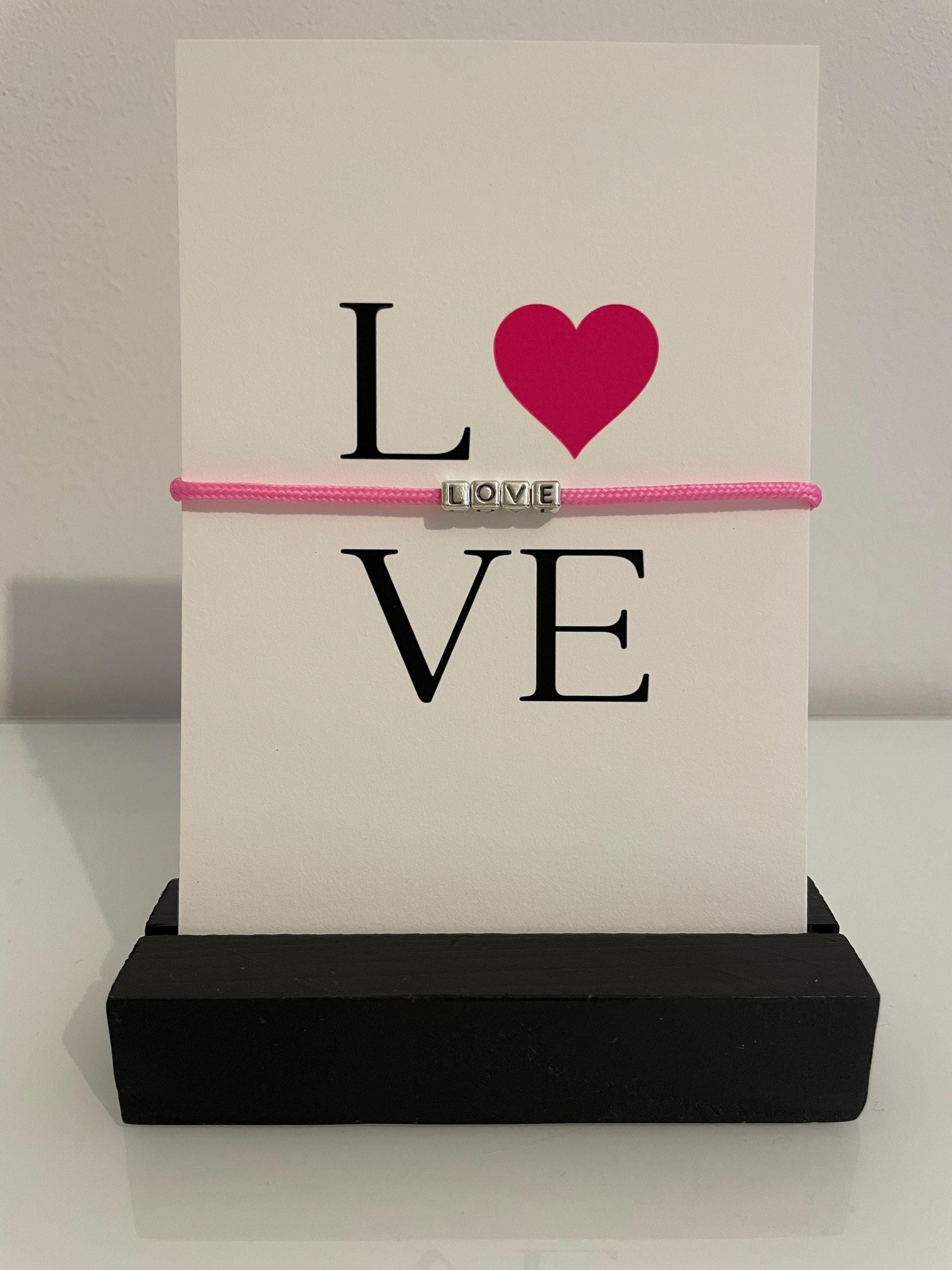 Diese liebevoll gestaltete Grußkarte eignet sich perfekt zum Valentinstag, Jahrestag, zur Hochzeit oder zum Muttertag. Sie kombiniert eine stilvolle Schmuckkarte mit Schmucksteinen, die das Wort „LOVE“ bilden. Das versilberte Armband mit pinkem Segelseil und praktischem Schiebeverschluss macht das Geschenk besonders elegant.