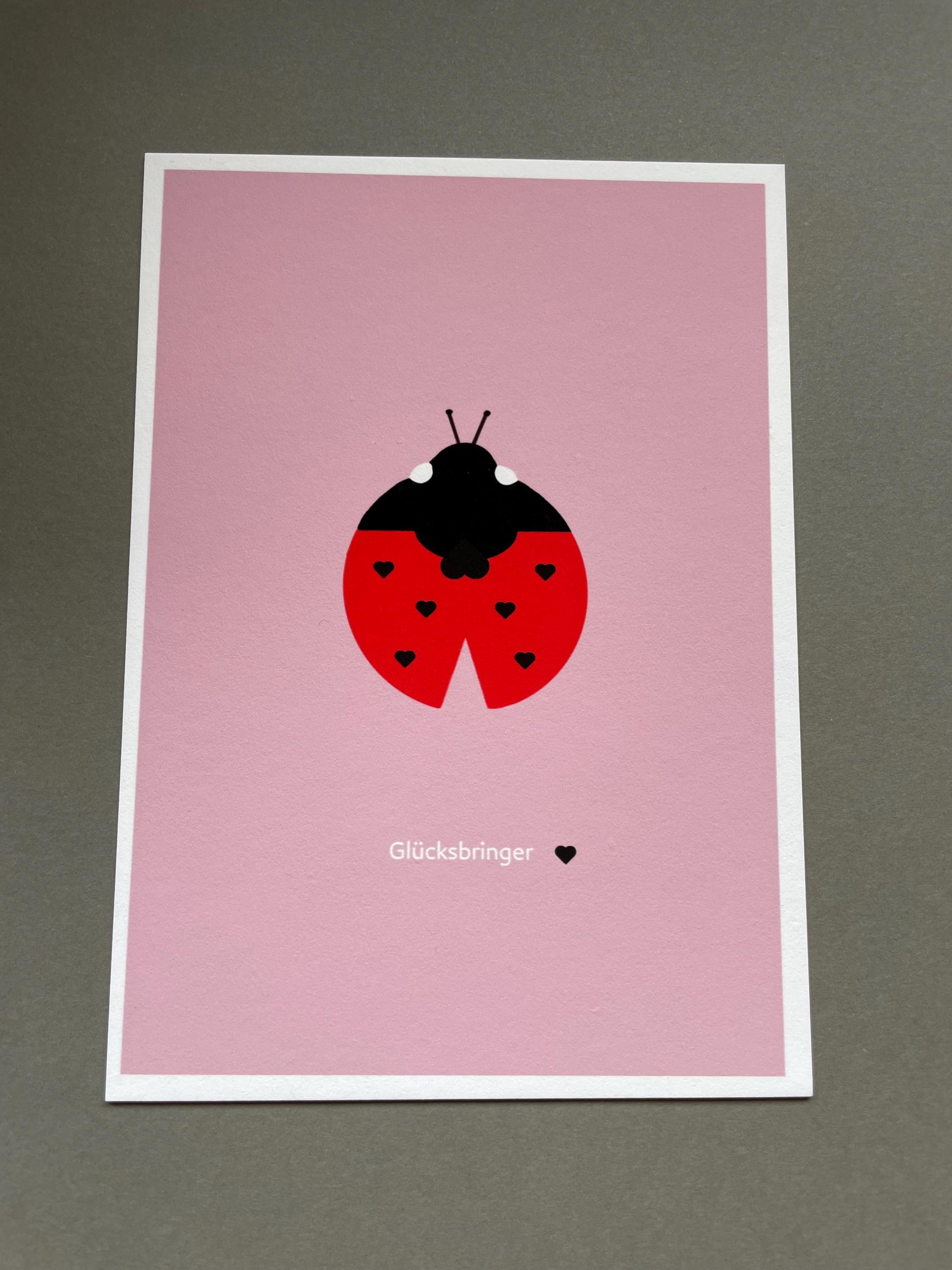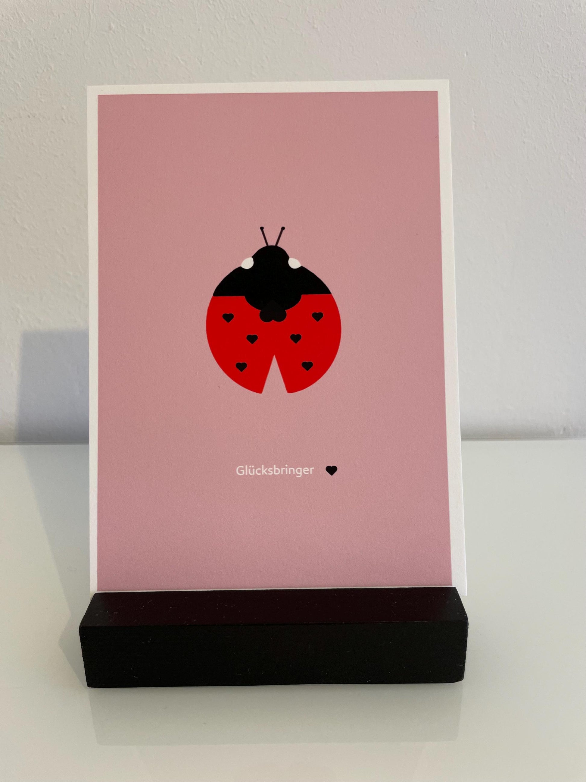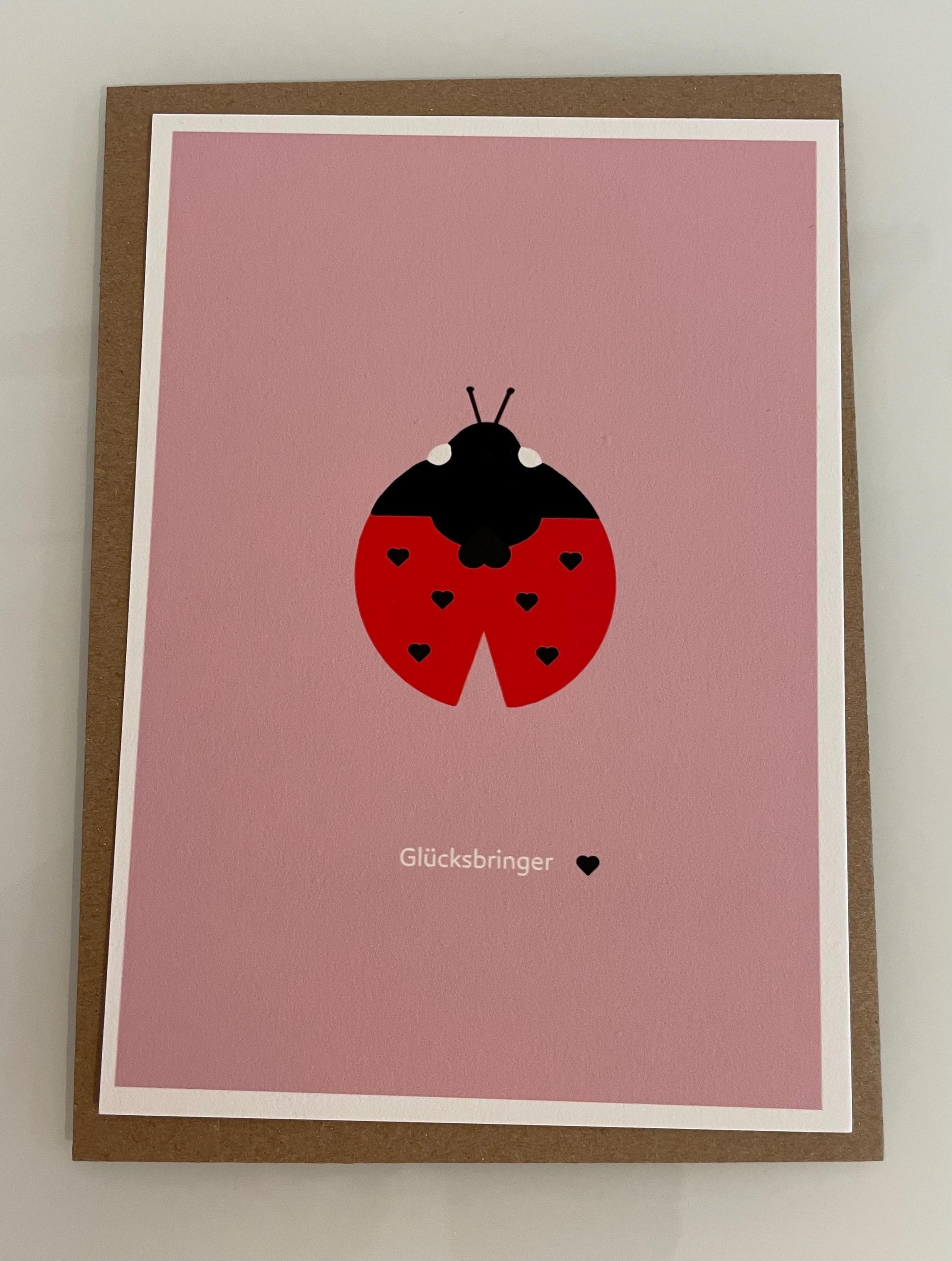 Eine moderne, handgemalte Geschenkkarte mit Marienkäfer-Motiv in schönen Rosa- und Rottönen.