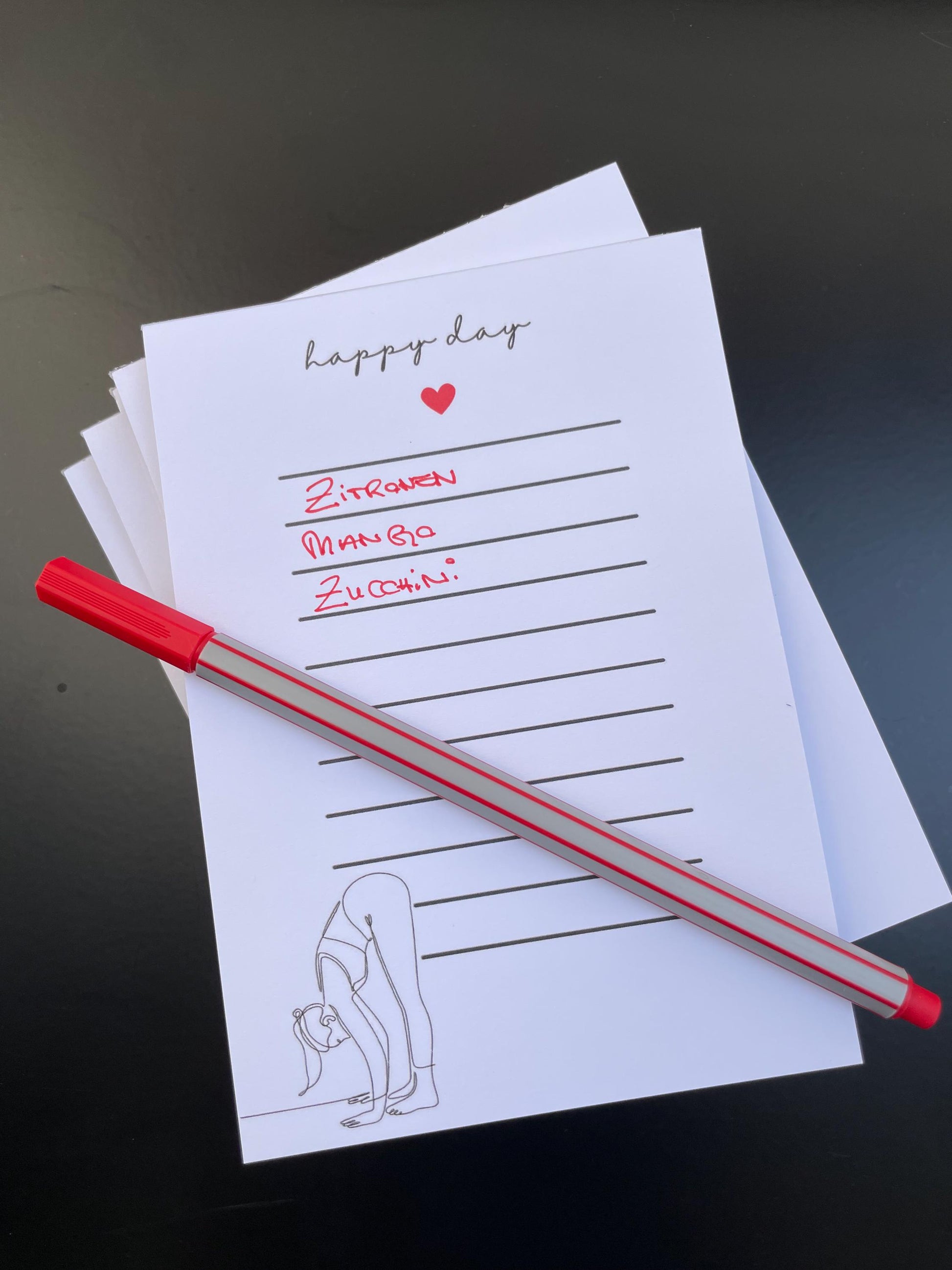 Dieser liebevoll gestaltete Notizblock „happy day“ im A6-Format ist der ideale Begleiter für deinen Alltag. Nutze ihn als Einkaufszettel, To-do-Liste oder Yoga-Journal. Wie sagt man so schön: „aus dem Kopf auf‘s Papier“. Perfekt auch als Geschenk – z.B. in Kombination mit meinen passenden Yoga-Karten.