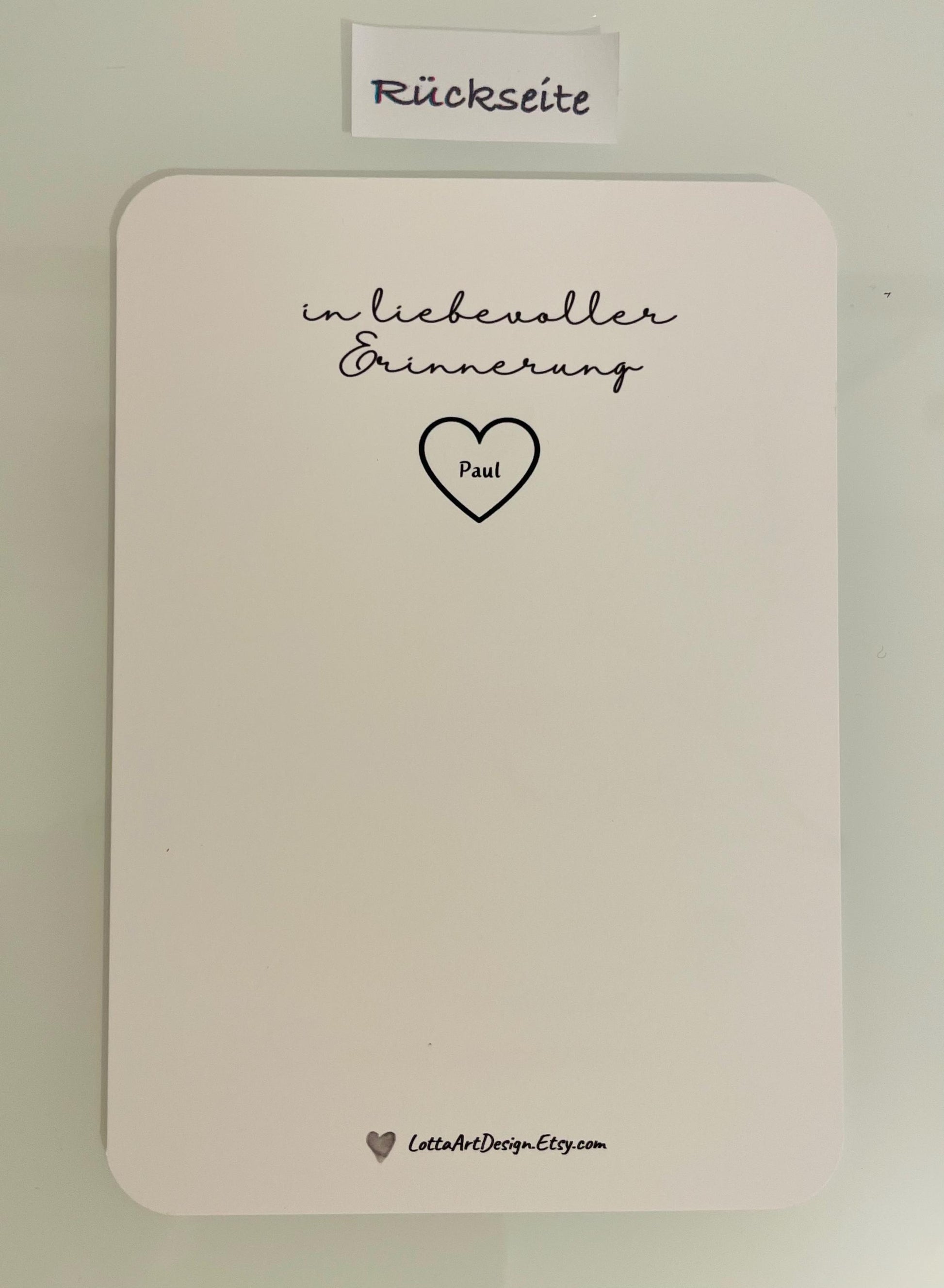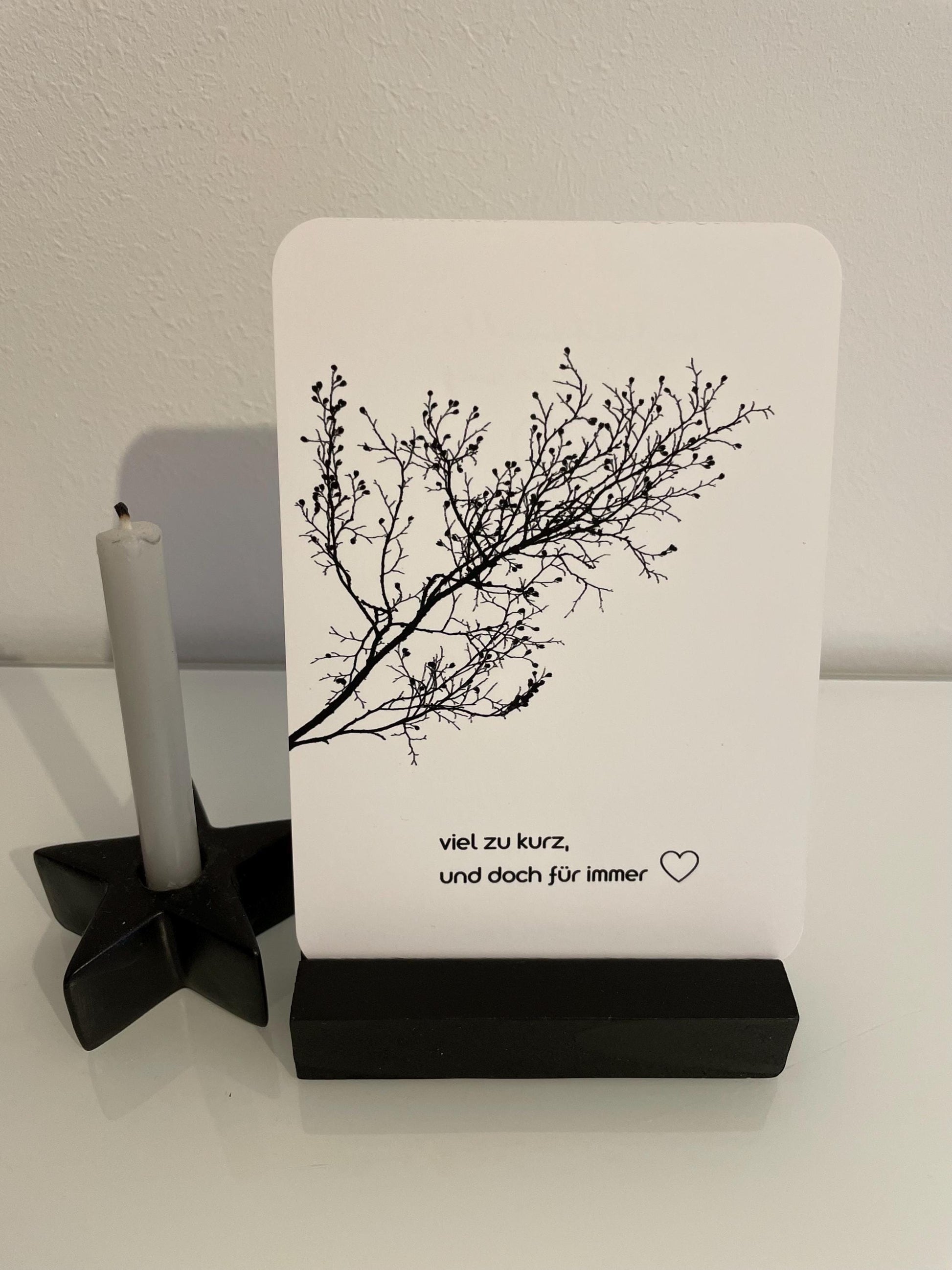 Trauerkarte mit Zweigmotiv und den Worten „viel zu kurz, und doch für immer“. Auf der Rückseite: „In liebevoller Erinnerung“ - darunter der Name, sanft von einem Herz umrandet.