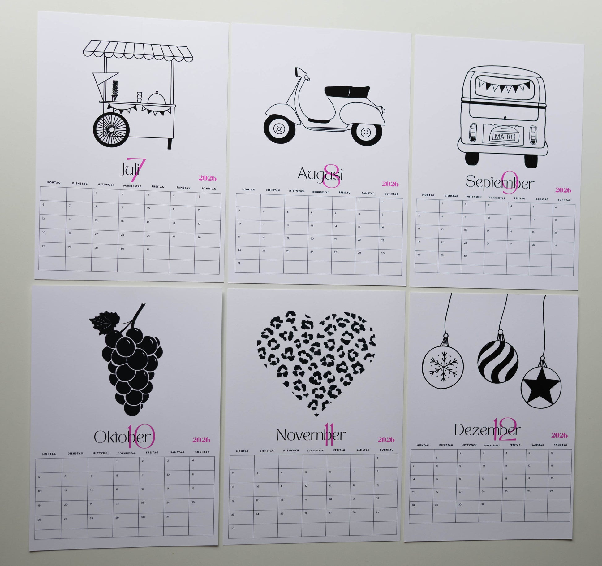 Wandkalender 2026 – Handgemachte Illustrationen & modernes schwarz-weißes Design.